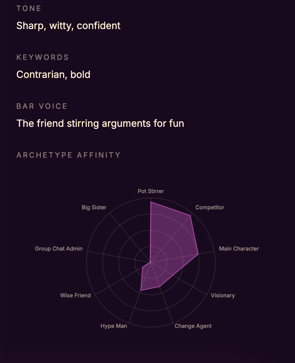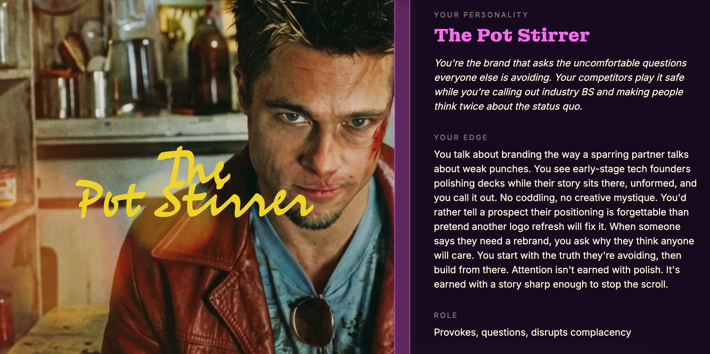 We wanted something that feels familiar but gives you something genuinely useful at the end. Based on how you answer, the test surfaces the specific personality traits that make you distinct, so what you get back isn’t a generic archetype description. It’s a profile built from how you actually showed up in the questions. Your edge, in plain language you can use to your advantage.