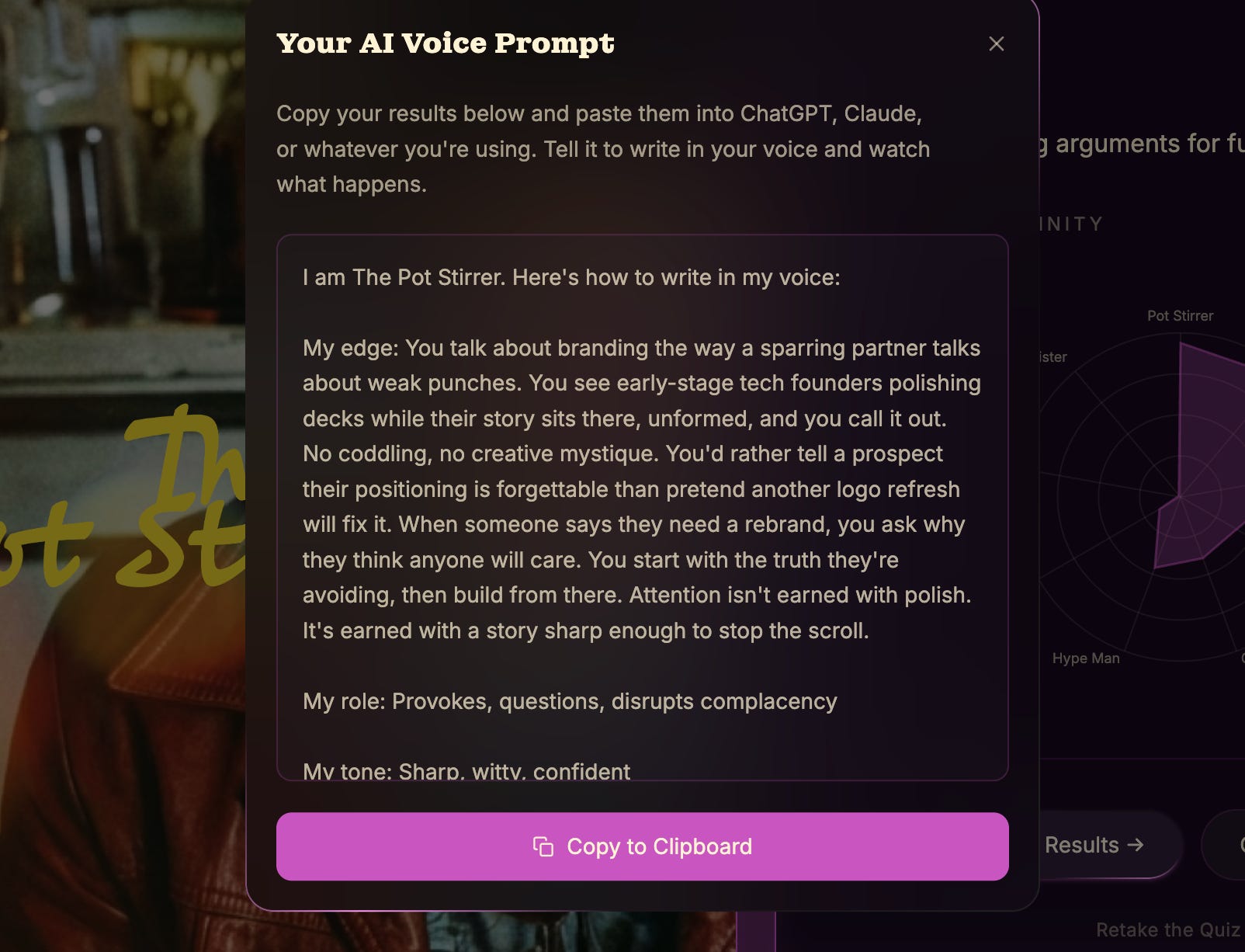 My team and I created a Personality Test for anyone who’s frustrated by getting generic, lifeless outputs from AI. Whether you’re a founder building a company, a marketer working for one, or building your own personal brand, this is designed to help you figure out what makes you you, so you can actually use AI as a competitive advantage.
